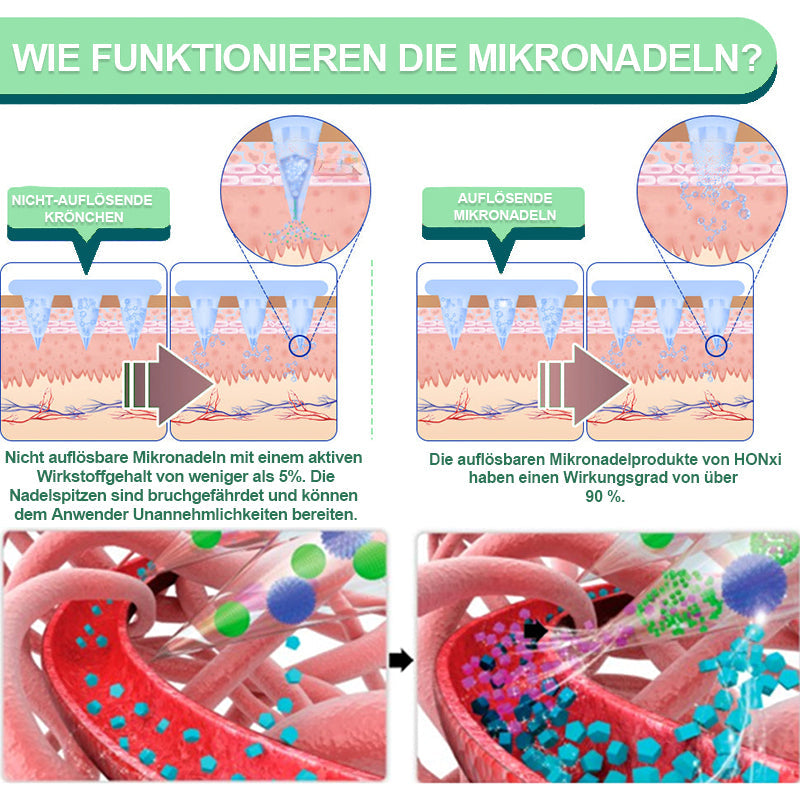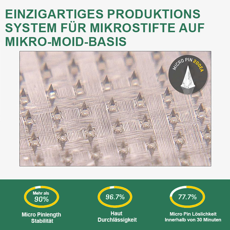 Jede Nadel ist 0,27 mm lang, also nur 1/7 der Dicke eines Haares, und besteht aus lรถslichem Medikament. Diese Mikronadeln werden mit modernsten Fertigungstechniken prรคzise gefertigt, um ein nahtloses, schmerzfreies Erlebnis zu gewรคhrleisten und gleichzeitig die Wirkstoffe effektiv direkt in die Haut zu transportieren.